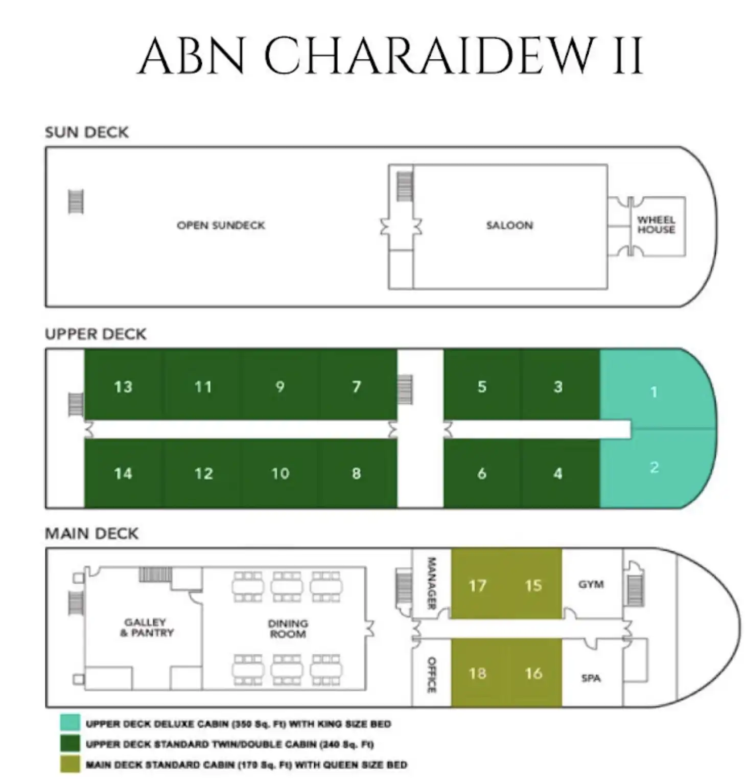 Cabins: 18: two spacious deluxe cabins (350 sq. feet) and 12 spacious twin/double cabins (240 sq. feet) are on the Upper Deck while four cabins with queen size bed (170 sq).