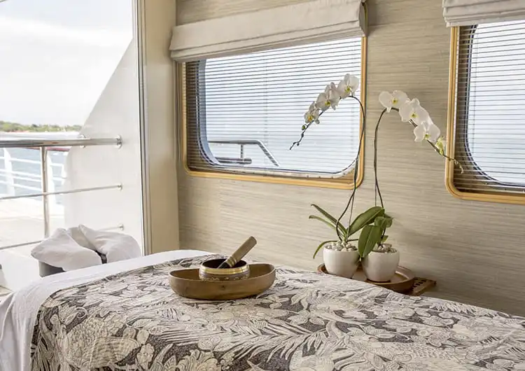 Inside the five-deck, 15-suite Aqua Blu, Cor has tastefully paired a brass-and-ivory interior theme with generous and inviting indoor and outdoor social spaces, including a sun deck.