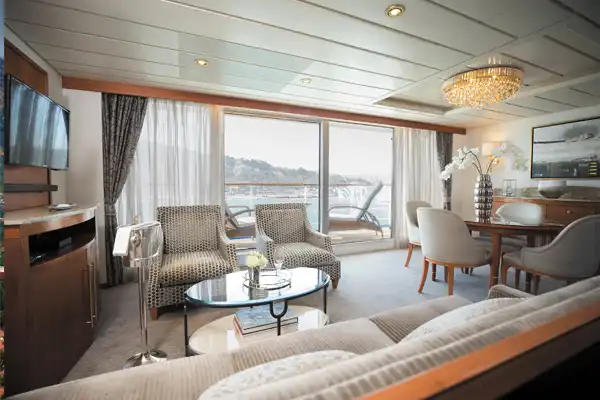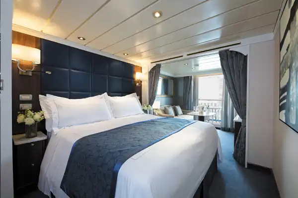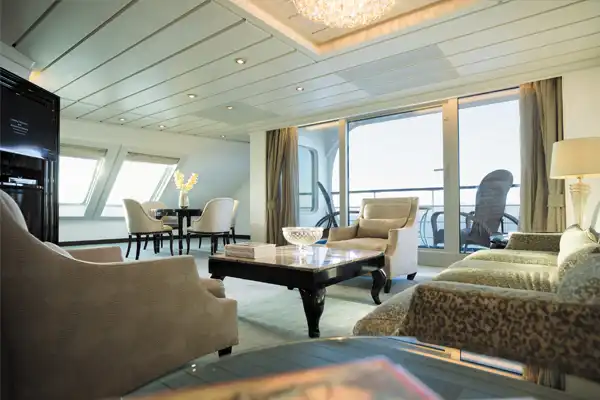 You'll find Park Avenue chic onboard Seven Seas Mariner® in this spectacular Master Suite. Elegant rosewood furniture, luxe fabrics and a crystal chandelier create sophisticated comfort, while a personal butler is available to fulfil whatever requests you may have. With one bedroom, two-and-a-half baths, a large living room and two private balconies, this sublime suite is perfect for hosting new friends in luxury.